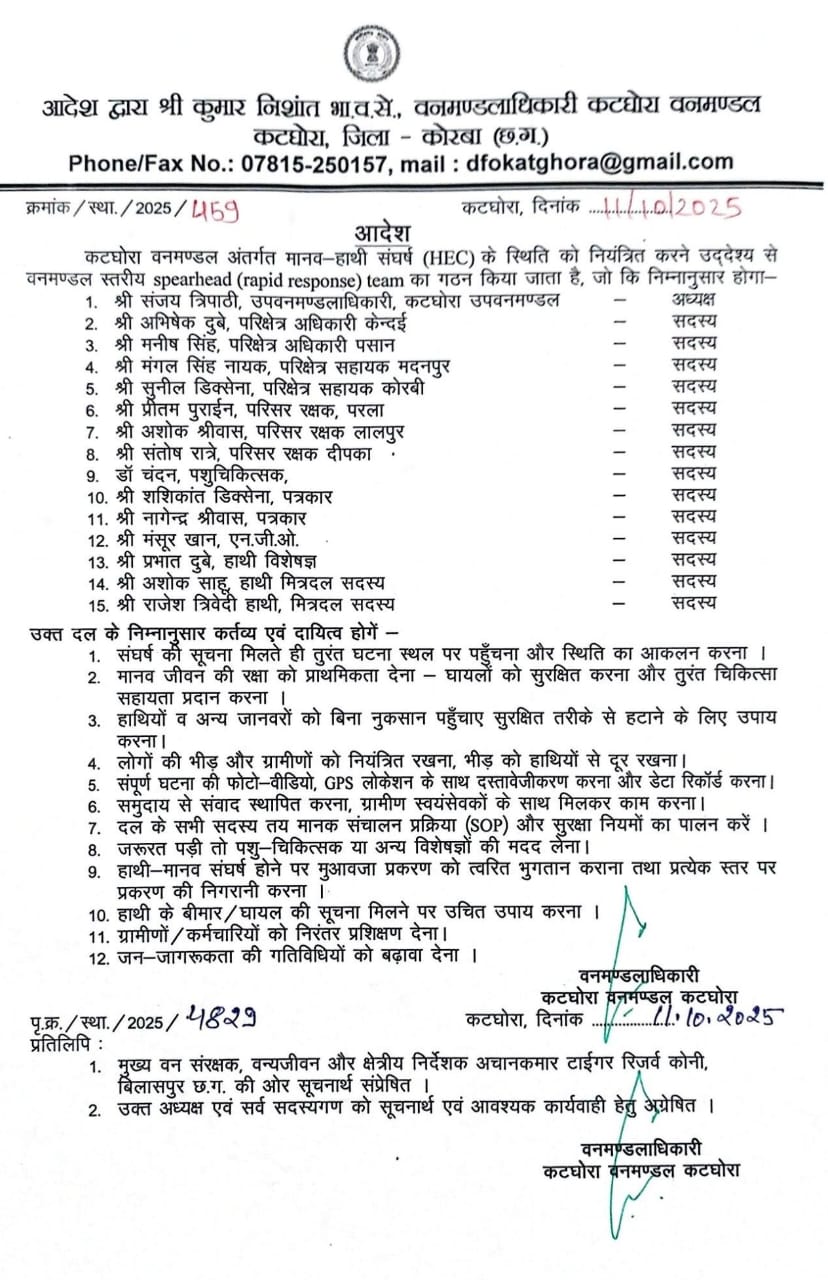 वनमंडलाधिकारी कटघोरा कुमार निशांत ने आदेश में कहा है कि यह दल किसी भी संघर्ष की सूचना पर तुरंत मौके पर पहुंचेगा, घायलों को सुरक्षित करेगा और हाथियों को बिना नुकसान पहुंचाए सुरक्षित दिशा में मोड़ेगा। साथ ही, प्रत्येक घटना की फोटो-वीडियो व GPS लोकेशन सहित रिपोर्ट तैयार की जाएगी और मुआवजा प्रकरणों को प्राथमिकता से निपटाया जाएगा।