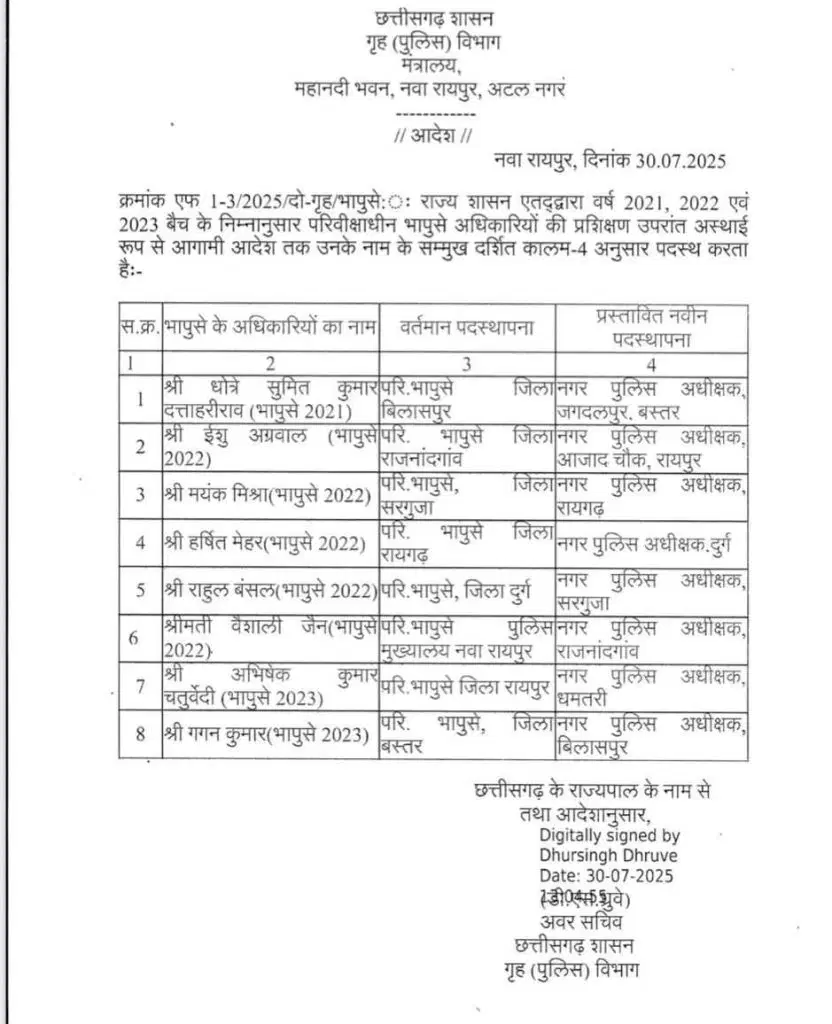 IPS राहुल बंसल को दुर्ग से सरगुजा, IPS वांसल जैन को पुलिस मुख्यालय से राजनांदगांव, IPS अभिषेक चंद्रवेद्ती को रायपुर से धमतरी, IPS गगन कुमार को बस्तर से बिलासपुर भेजा गया है,