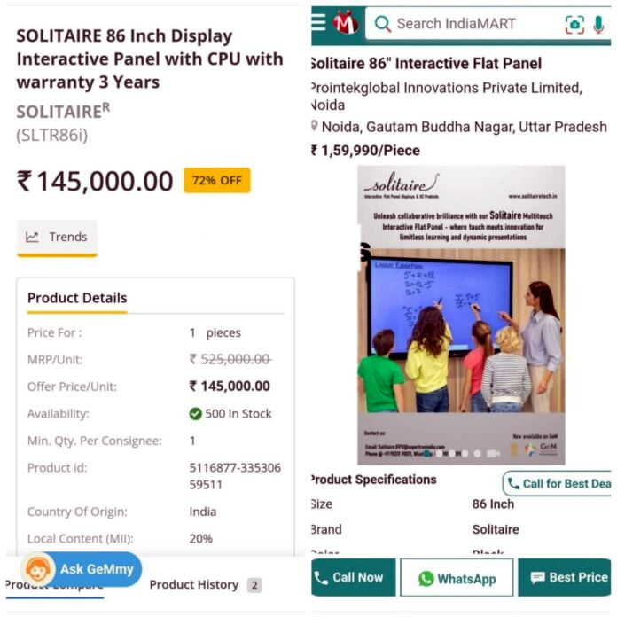 सोसल में मीडिया में सेम उत्पाद सॉलिटेयर 86 इंच डिस्प्ले इंटरएक्टिव फ्लैट पैनल विथ सीपीयू 3 ईयर वारंटी के साथ दो कोटेशन भी सोसल मीडिया में वायरल हो रहे हैं, जिसमे एक कोटेशन में सॉलिटेयर 86 इंच डिस्प्ले इंटरएक्टिव फ्लैट पैनल विथ सीपीयू 3 ईयर वारंटी की कीमत 1,59,990/- रु और दूसरे कोटेशन में सेम उत्पाद की कीमत 1,45,000/- रु उल्लेखित है,