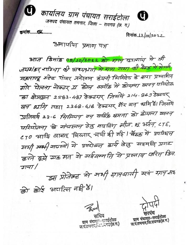 रायगढ़ /रायगढ़ जिले में तमनार ब्लाक के ग्राम पंचायत सराईटोला में हाल ही में जंगल की कटाई को लेकर माहौल गरमाया हुआ है,जिसमे नित नए खुलासे हो रहें है,अब यहां जंगल काटने की पर्यावरणीय अनुमति के लिए फर्जी ग्राम सभा आयोजित करने की जानकारी सामने आ रही है, इसके लिए न तो वैध प्रक्रिया अपनाई गई और न ही स्थानीय आदिवासी समुदाय की सहमति लेना जरूरी समझी गई,