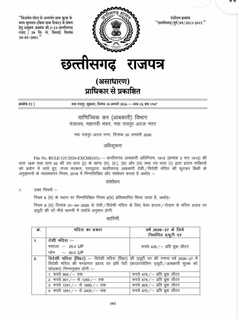 रायपुर/ शराब के शौकीनों को अब छत्तीसगढ़ में ज्यादा कीमत चुकानी पड़ सकती है, दरअसल राज्य सरकार द्वारा शराब पर लगने वाली नई ड्यूटी दरें 1 अप्रैल 2026 से लागू की जाएंगी, इस संबंध में जारी अधिसूचना छत्तीसगढ़ के राजपत्र में प्रकाशित कर दी गई है।