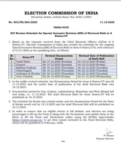 उत्तर प्रदेश में SIR की आखिरी तारीख 26 दिसंबर तक है,वहीं तमिलनाडु और गुजरात में 14 दिसंबर तक और मध्य प्रदेश, छत्तीसगढ़ और अंडमान निकोबार आइलैंड में 18 दिसंबर तक समय सीमा बढ़ाई गई है,