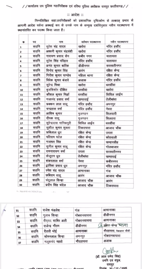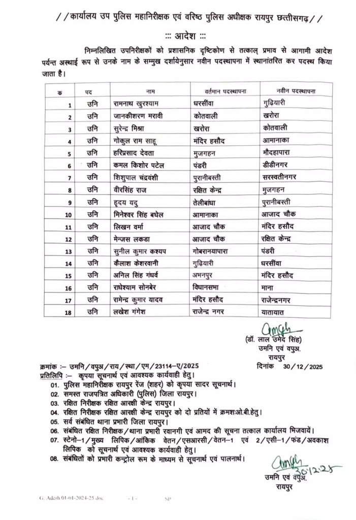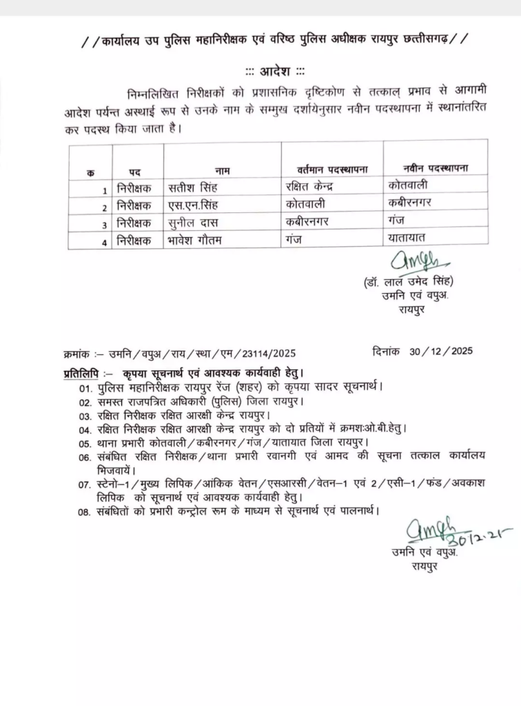 रायपुर /IG-SSP की बैठक के बाद 59 पुलिसकर्मियों का ट्रांसफर हुआ है इस आदेश में 4 TI, 18 सब इंस्पेक्टर और 37 ASI शामिल है,कोतवाली थाने में तैनात SN सिंह को कबीर नगर के जिम्मेदारी की गई है,वहीं कबीर नगर से TI सुनील दास को गंज थाने भेजा गया है,भावेश गौतम को यातायात की जिम्मेदारी दी गई है तो वही इंस्पेक्टर सचिन सिंह होंगे रायपुर शहर के नए कोतवाल,