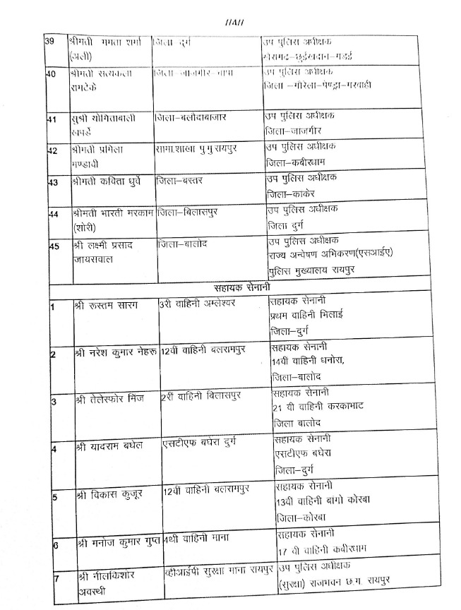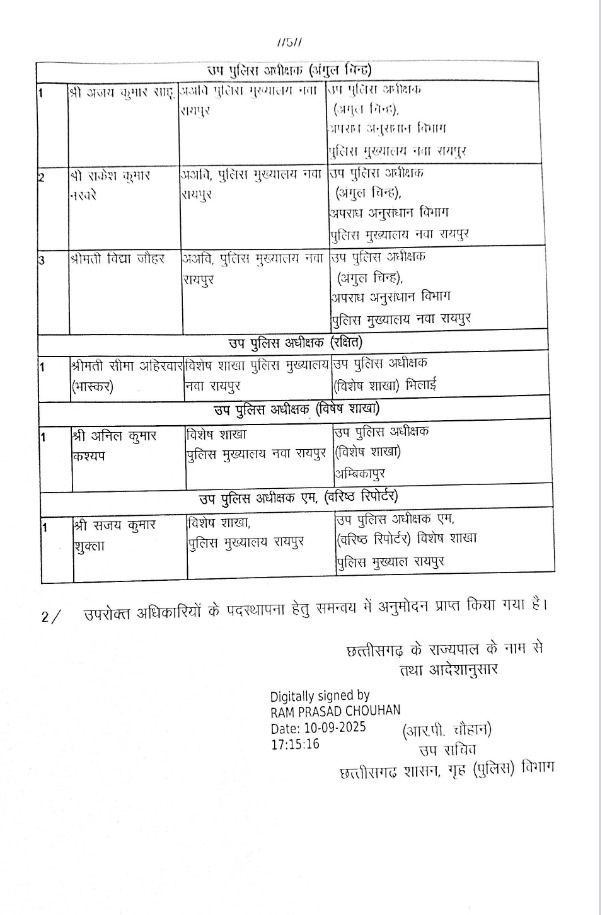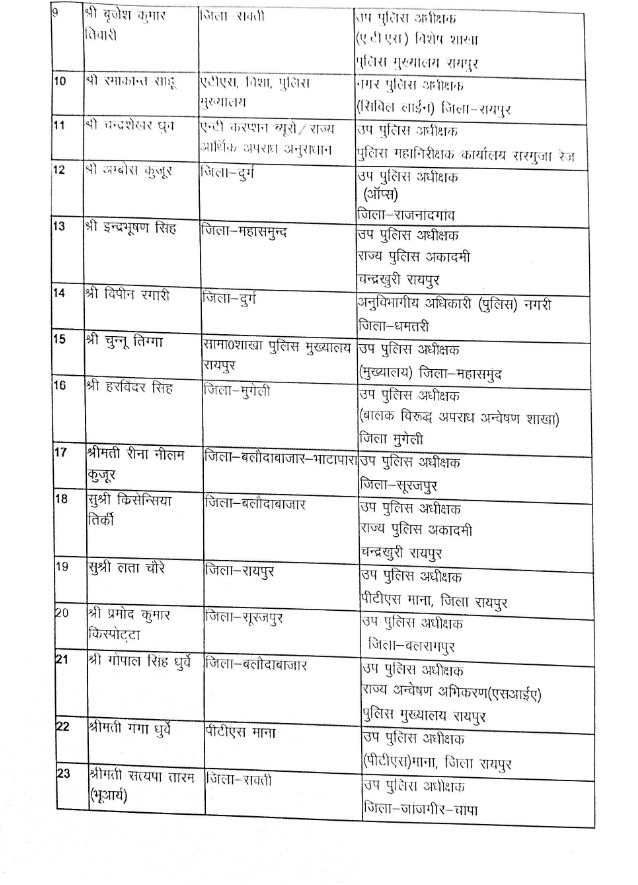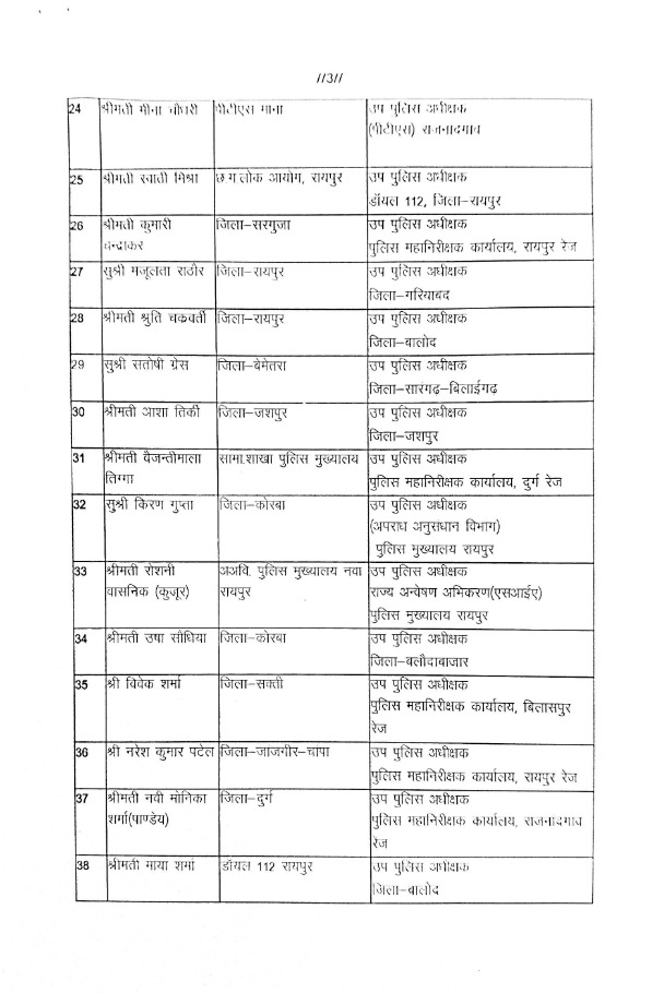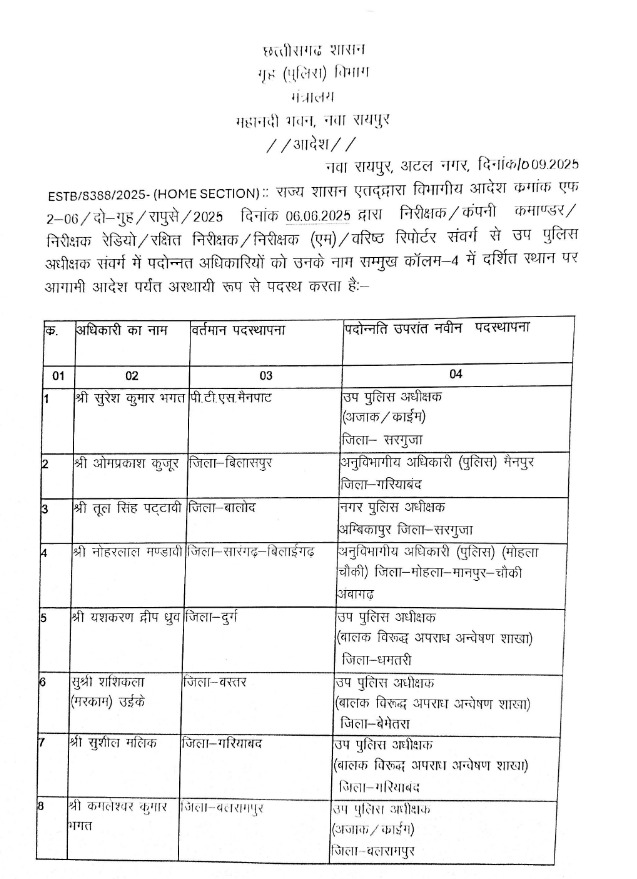 रायपुर /डीएसपी के पद पर पदोन्नत हुए पुलिस अफसरों को अंत:पोस्टिंग दे दी गयी,दरअसल 6 जून 2025 को निरीक्षक, कंपनी कमांडर, निरीक्षक रेडियो और रक्षित निरीक्षक से उप पुलिस अधीक्षक संवर्ग में पदोन्नत अधिकारियों को नयी पदस्थापना दे दी गयी है,इसमें कुल 58 डीएसपी को पदस्थापना दी गयी है,देखिये आदेश–